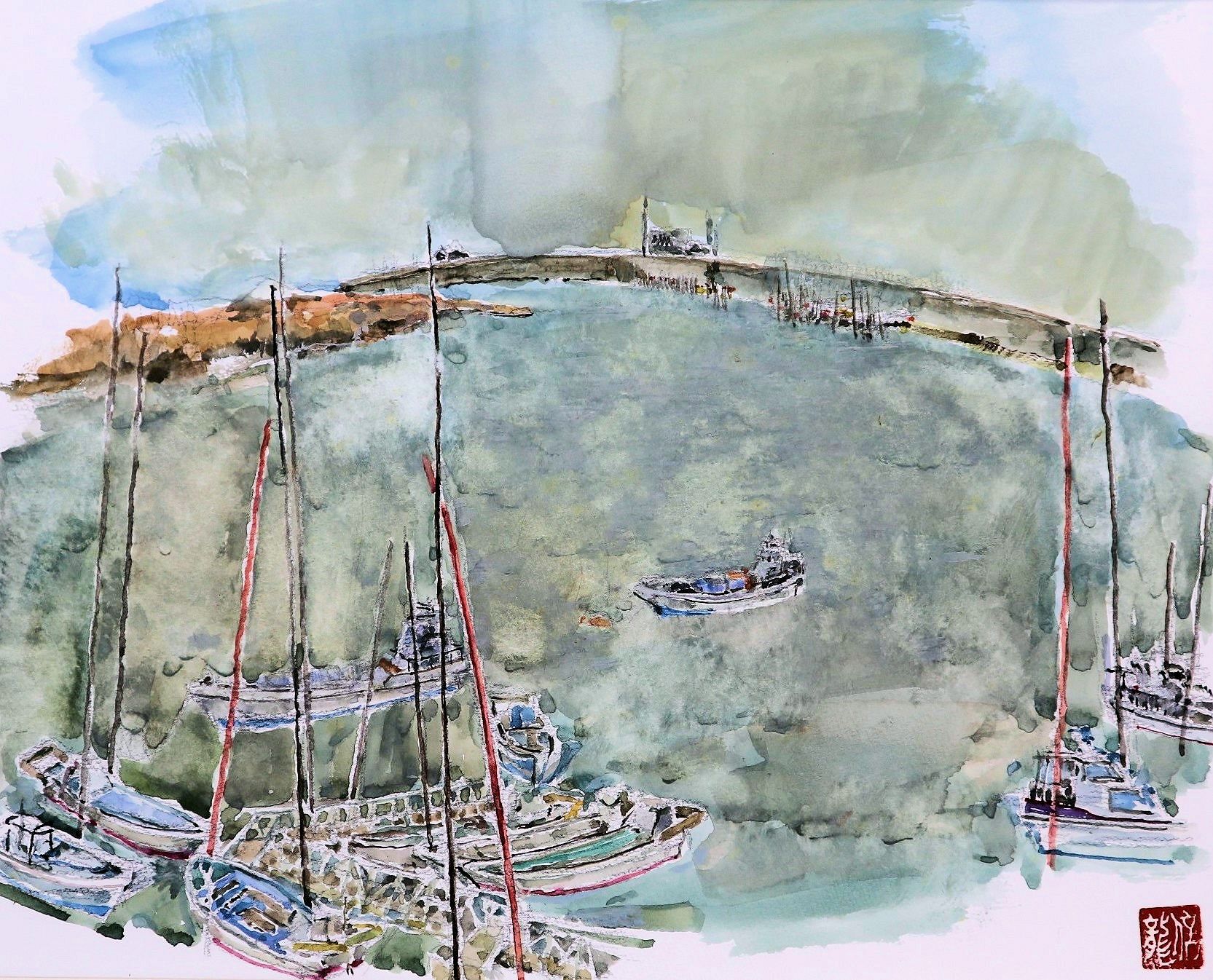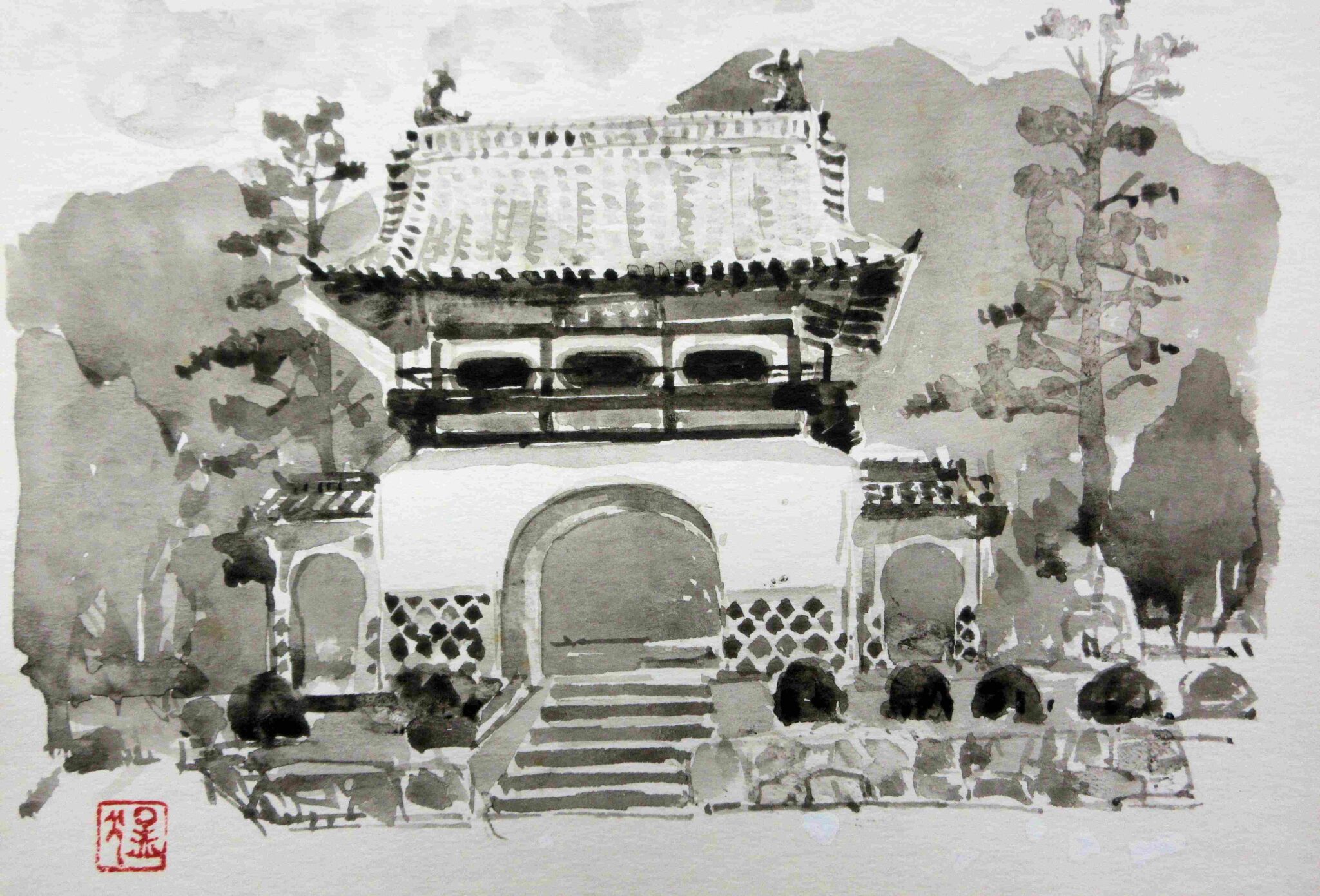 はじめに水彩画用のボード紙に耐水性のペン(黒)で形を描きます。以前は下絵を描かずに思いつくままに描いていましたが、最近は大まかな下絵を描くことが多くなりました。線描きが終わったら、先の細い筆を使い水性の絵の具でチマチマと彩色します。一般的な絵の具と固形水彩絵の具を併用しています。絵の具は混ざると濁ってしまうので、できるだけ混ぜないようにしています。絵の具皿には100色くらいの絵の具が並んでいます。これまで(多分)300枚以上は描いてきました。最近はアルファベットや漢字にも応用しています。